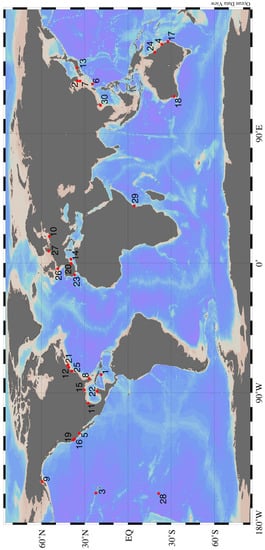 Locations of studies reviewed in this paper. All studies measured the effects of SGD on marine biota. Numbers correspond to locations in Table 1. Figure made with Ocean Data View [54].