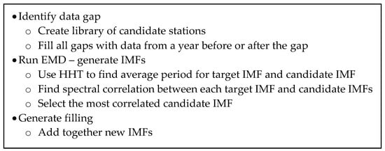 - Moghtaderi, A.; Borgnat, P.; Flandrin, P. Gap-filling by the empirical mode decomposition. In Proceedings of the 2012 IEEE International Conference on Acoustics, Speech and Signal Processing (ICASSP), Kyoto, Japan, 25–30 March 2012; pp. 3821–3824. [Google Scholar]