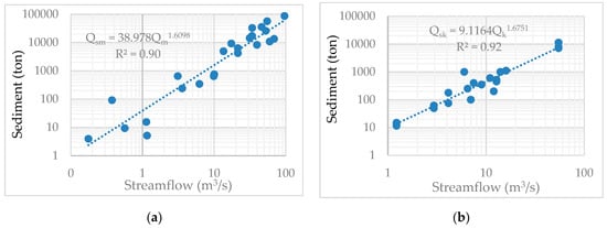 Scattered plot of sediment load vs. streamflow for (a) Meki River and (b) Ketar River.