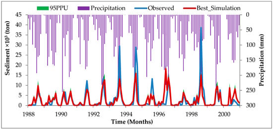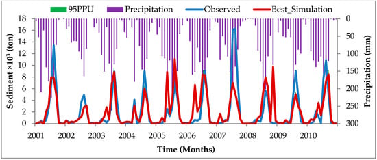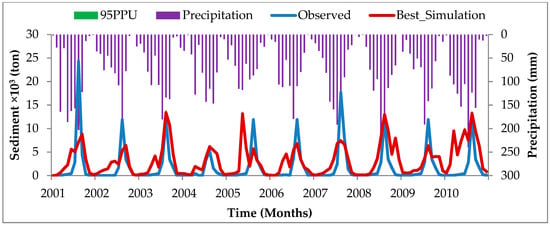 It has been revealed in a study conducted by Adem et al. [] in the Upper Gilgel Abay of the Blue Nile Basin in Ethiopia that sediment yield was related to a change in climate variables and thus to streamflow. The variation in the values of sediment yield due to streamflow change that resulted from climate change has also been reported by many scholars [,,,,]. In a similar study, average annual sediment loads generally decreased in response to climate change by 23.5% and 3.3% under RCP4.5 and RCP8.5, respectively in the mid-century (2046–2065) []. Li et al. [] predicted the annual rate of decrease in water and sediment discharges mainly controlled by climate variability. Rodríguez-Blanco et al. [] also showed that suspended sediment is generally expected to decrease in 2031–2060 by 11%, and in 2069–2098 by 8%, as compared to the baseline period (1981–2010). This was mainly due to decreased streamflow in response to climate change.