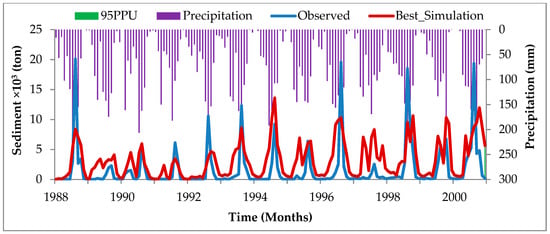 The calibration and validation of the SWAT model for sediment yield are illustrated in Figure 4, Figure 5, Figure 6 and Figure 7 for the Meki and Ketar rivers. The results showed a good agreement between the observed and simulation values for calibration and validation periods, with R2 and ENS indicated in Table 4. According to Pereira et al. [], the model performance for sediment yield estimation was in the satisfactory range. The model performance efficiency for the calibration and validation periods was lower for the Ketar River as compared to the Meki River. This might be due to the scarcity and uncertainty of the collected data. The efficiency results of the SWAT model in this study showed similarity with other studies in different parts of the world in simulating sediment yield. A study by Adem et al. [] in the Upper Gilgel Abay of the Blue Nile Basin in Ethiopia showed similar efficiency values of SWAT model calibration and validation for sediment yield estimation. Ayana et al. [] examined the applicability of SWAT in estimating runoff and sediment yields in the Fincha watershed in Ethiopia. It was concluded that the SWAT model performed well in predicting flow and yield in a given watershed. Similar results were reported by Ayele et al. [] in the Upper Blue Nile Basin. Gathagu et al. [] used the SWAT model in the Thika-Chania catchment in Kenya to evaluate soil and conservation practices to control sediment yield, and found satisfactory results. Licciardello et al. [] also evaluated the SWAT model in simulating sediment deposition in a Sicilian reservoir by comparing with different bathymetric measurements. The study revealed that there is a higher efficiency coefficient between sedimentation volume simulated by the SWAT model and that obtained from bathymetric measurements.