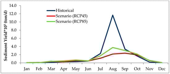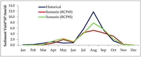 Figure 8 and Figure 9 depict that there will a decrease in the average monthly sediment yield for both rivers under both scenarios during the rainy season (July, August, and September) in the scenario period (2041–2070) as compared to the historical period (1985–2010).