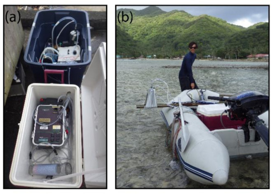 In each study location, SGD rates were calculated using dissolved 222Rn as a groundwater tracer. To account for the temporal (tide dependent) and spatial (geology dependent) variability of SGD in volcanic island settings, a fixed location time series 222Rn measurement was coupled with a moving coastal water 222Rn survey in each embayment following the methods of Dulaiova et al. [55]. During the time series, a peristaltic pump brought coastal water from a stationary point generally located within 40 m from shore to an instrument package on land that continuously measured 222Rn concentration and salinity (Figure 3a). Time series measurements were conducted over one full tidal cycle (>12.2 h) at each location. Coastal water surveys were conducted either before or after each time series, during a 3 h period bracketing low tide. The same 222Rn and salinity sensors used in the time series were mounted on a small inflatable boat that was motored through each bay in a series of shore parallel transects at roughly 0.75 m/s (Figure 3b). Shore-perpendicular transects were also conducted if time allowed. During each survey, eight to twelve coastal surface-water samples were collected. Time series derived SGD fluxes were scaled with spatial information from the 222Rn surveys to calculate total daily SGD fluxes to each of the four embayments.