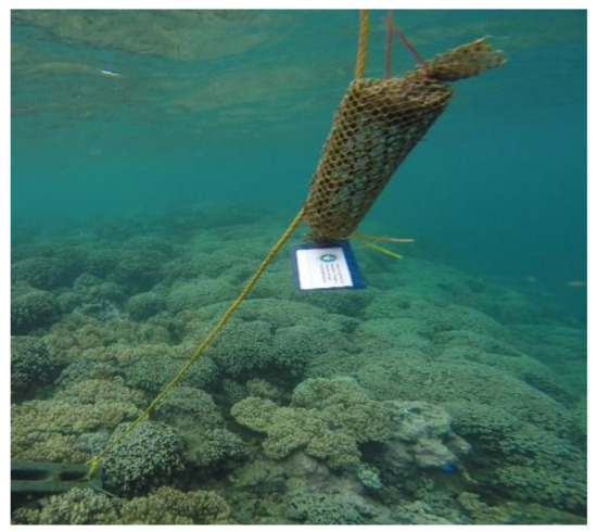 On August 5th 2016, seventy-five specimens of Hypnea pannosa were collected at an open coastal location near Pala Lagoon and pre-treated in a 16 L indoor growth chamber filled with ambient ocean water to draw down tissue N levels, following Amato et al. [8]. An average irradiance of 5700 l× (measured with a Digital Light Meter Model # FCM0-10M+, Phytotronics Inc., Earth City, MO, USA. was provided by six LED flood lights (Philips Model #9290002322) placed 25 cm above the water surface. On August 8th, 2016, reagent grade nutrients (NaNO3 and NaPO4) were added to the seawater to bring the nutrient levels to 0.5 µM NO3− and 0.05 µM PO4− (assuming the original seawater had negligible nutrient levels after 72 h in algal culture). Salinity was monitored and distilled water was added every day to maintain a salinity of 35. To assess pre-treatment variability in tissue N parameters, three H. pannosa specimens were randomly selected from the collected samples prior to pre-treatment and prepared and submitted for tissue analysis as above. On August 10th–11th, 2016, thirty-six H. pannosa specimens, with an individual mass of 5–6 g, were randomly assigned and deployed throughout the four study locations (Figure 2) in 8 cm × 20 cm cylindrical cages. Individual H. pannosa with tissues that were undifferentiated, without reproductive, holdfast or stype structures were selected for deployment. The cages, which were constructed of 8 mm diameter plastic mesh and polyester fabric, were designed to allow water flow but exclude macroherbivores (Figure 4). At each site, a caged H. pannosa specimen was tethered 0.25 m below the surface to a small float and anchored to a cinder block. Eight cages were distributed throughout the bay at each study location. Three additional cages were deployed at outer Faga’alu at sites adjacent to the wastewater treatment facility. After eight days, all cages were retrieved, and samples were prepared for tissue analysis as above. For comparison between each location, algal samples were grouped by study location and statistical tests were performed using SigmaPlot 11 (Systat Software Inc., CA, USA). One-way ANOVA (identified by the F-statistic) and Tukey’s pairwise comparisons were used to compare parameters if test assumptions were not violated. The nonparametric Kruskal–Wallis ANOVA (identified by the H-statistic) was performed if the assumptions of normality or homoscedasticity were violated.