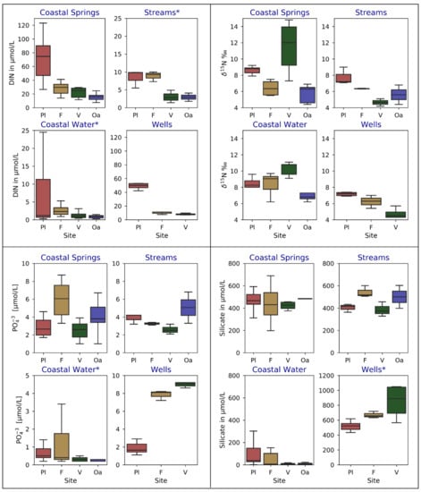 To compare water quality between study locations, water samples were grouped by sample type (coastal surface water, CGW, streams, and wells), and study location before taking arithmetic means of each group (Figure 5). Concentrations of DIN in coastal surface waters and CGW showed statistically significant differences between all study locations (ANOVA p-values of >0.002), with Pala Lagoon having the highest (8.0 ± 13.0 µmol/L) and Oa Bay the lowest (1.2. ± 1.5 µmol/L) DIN values in coastal surface waters. Few statistically significant differences were found between locations for PO43− concentrations, although some sample types, notably streams in Oa, well waters in Vatia, and coastal springs in Faga’alu and Vatia, had significantly higher levels of PO43−. Silicate concentrations also showed few significant differences among sites, except for notably higher concentrations in Vatia’s wells. All geochemical data are provided in Supplementary Material, Tables S1 through S5. It should be noted that because salinity varied widely amongst CGW samples, nutrient concentrations (DIN, PO43−, and silicate) reported for CGW values as shown on Figure 5 were normalized to the freshwater salinity of 0.1 using an un-mixing calculation [11] based on the local oceanic salinity and nutrient composition. Analytical uncertainties for nutrient concentrations and isotopic values were determined through applying the standard error of the estimate to duplicate samples. This yielded uncertainty values of ± 3.1 µmol/L for TDN, ± 2.8 µmol/L for N + N, ± 6.2 µmol/L for Si, ± 0.1 µmol/L for PO43−, and ± 0.01 µmol/L for NH4+, and ± 0.26‰ for δ15N values.