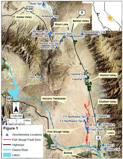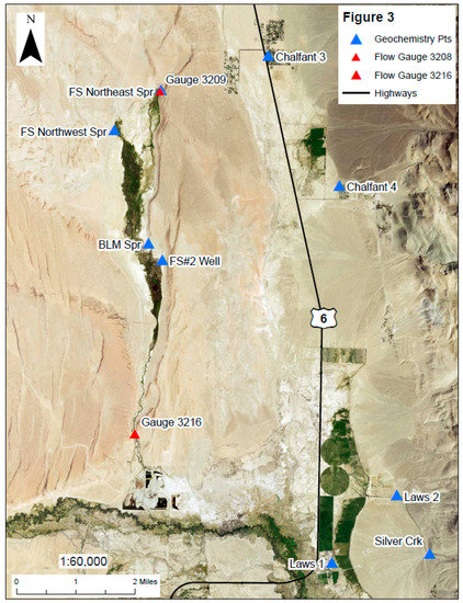 In 2002, Chapman [8] conducted reconnaissance-level sampling for stable isotopes in the Fish Slough area on behalf of the BLM. In 2006, the U.S. Geological Survey (USGS) conducted groundwater sampling and analysis in the region as part of the Groundwater Ambient Monitoring and Assessment (GAMA) program. Groundwater from the Eastern Sierra was sampled in the vicinity of Laws, Chalfant Valley, Hammil Valley, and Benton/Benton Hot Springs, among others, and analyzed for a comprehensive suite of groundwater constituents and characteristics. The data from that effort is publicly available on the National Water Information Service (NWIS) website [9].
