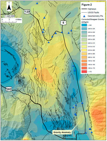 The analytical results from these samples were combined with previously collected data from wells and springs to evaluate water sourcing in the region (Table 1 and Table S1). The Pan American Center for Earth and Environmental Studies (PACES) compiled USGS terrain-corrected, complete Bouguer anomaly reduced to background density of 267 gravity data from gravimeter stations across the United States. Hildenbrand [15] describes the data gathering efforts. PACES regional geospatial service center’s online “Gravity and Magnetic extract utility” at http://research.utep.edu/default.aspx?tabid=37229 was used to download Eastern Sierra data. The gravity anomaly contour map (Figure 2) was created using the ArcMap Geostatistical Analyst Empirical Bayesian Kriging. These more recent data largely agree with and confirm the presence and location of the bedrock block identified by Pakiser et al. [16] and noted by Bateman [3] and Hollet et al. [7].