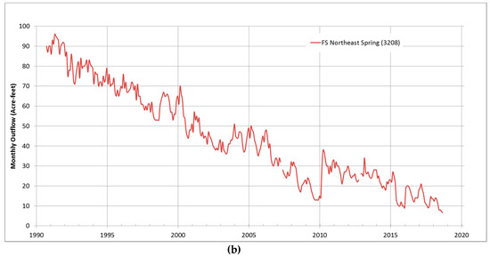 Northeast Spring is measured at a Parshall flume, Gauge #3208 (“Fish Slough Below Pond 1”). As shown on the hydrograph (Figure 4b), consistent flow measurement at this location has occurred from 1990 through present [19]. As can be seen, flow at Northeast Spring declines steadily from 1990 with no indication that the spring flow has reached a stable volume. Flow data from gauges at Northwest Spring and BLM Spring are not presented here as field staff have noted [20] likely errors and inconsistencies caused by device failure or maintenance issues at those locations.