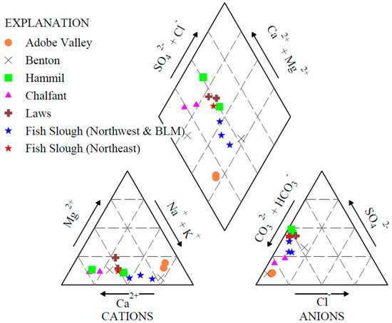 Thus, the character of waters in Fish Slough can be used to identify key potential source areas. With respect to the following water chemistry discussion, water types are referred to in a standard manner [23] based on the most common ions as expressed in milliequivalents per liter (meq/l). Therefore, water with the most common ions being sodium and sulfate would be termed a “sodium-sulfate” water (or Na-SO4 type). This term for water type is not referring to sodium sulfate as a specific compound (such as Na2SO4). This terminology also assumes that those dominant ions constitute more than 50% of the cations or anions present. If for instance sodium consisted of 40% of the cations and calcium 30%, then the water would be considered mixed, the ions would be named in order of dominance, and in this example the water would be a sodium-calcium-sulfate water [23].