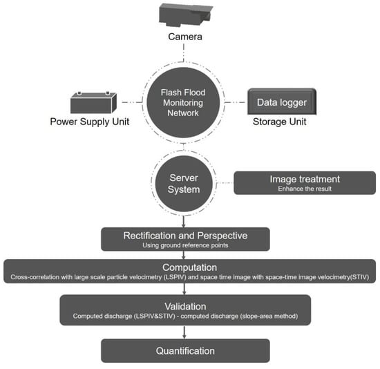 The procedure for flow and discharge analysis is depicted in Figure 3. The recorded flood was a medium-sized flood. Therefore, there was not enough flood water to be detected by the downstream cameras. The presented procedure is related to the upstream fixed camera. The recorded video was collected from the first installed camera on an elevated bridge (Figure 1b). The camera has a battery power supply and SD memory card. The video was converted into frames at 30 frames per second (fps). Then, the image treatment was performed to enhance the results. Next, ortho-rectification of the resulting images at different phases during flood rising, peak, and recession was defined for LSPIV and STIV calculations using the GRPs. Following this, the surface velocity was computed using LSPIV and STIV techniques. Then, we validated the computed discharges from the surface velocity for STIV and LSPIV using the computed discharges from the slope area method conducted by the Ministry of Regional Municipalities and Water Resources (MRMWR), Oman. Finally, the averaged velocities and discharge were quantified for all methods.