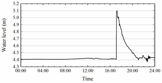 The total discharge was calculated, using the area velocity method and discharge equation where is the available water depth at each piece, is the measured velocity as a function of surface velocity, and α is the correction factor of 0.8 []. The surface velocity, , was measured at 41 defined segments of width, , along the cross-sectional field. The bathymetry of the wadi channel was measured by direct field survey and confirmed with the Digital Elevation Model (DEM) constructed by drone image processing. The water level at the cross section was measured based on real-time monitoring from the water level radar sensor (Figure 1c). In addition, we obtained the water depths from the surveyed bathymetry and the measured water levels.