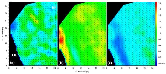 Images (a), (b), and (c) show the average flow patterns with velocity color maps using LSPIV for the rising, peak, and recession limbs, respectively, of flooding on 28 October 2018, left bank (LB), right bank (RB).