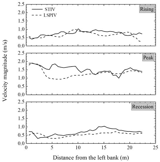 Comparison of cross-sectional surface velocities measured by LSPIV and STIV for the three flood stages.
