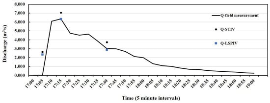 Figure 9 displays the validation of a computed discharge hydrograph measured by a rating curve from slope–area methods (Qm) and estimated discharges from the surface velocity distribution by LSPIV and STIV techniques. The results of the LSPIV and STIV were used to calculate the discharges (Q) with velocity area and average cross-sectional discharge (Qavg). The discharge started to suddenly increase from 17:00, reached its peak at 17:15, and decreased again after that, becoming dry over a longer time period; this indicates the general characteristics of wadi flash floods in wadi systems. At the peak stage, the estimated discharges by LSPIV (about 6.48 m3/s) show very good agreement with the computed discharge from the slope–area method and cross-sectional average discharges (6.343 m3/s). Most of the values resulting from the two techniques are located within the same range of computed discharge from a similar cross-section of slope-area methods. In the rising limb, the values from LSPIV and STIV do not match with the field discharge measurements due to the faster rise of the discharge volume and its short duration.