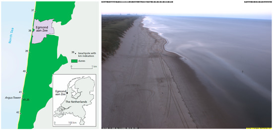 The study site is located south of Egmond aan Zee, between beach poles 41 and 42. The photograph on the right was taken from the Argus tower [35] and illustrates that the beach is fairly narrow and backed by a high foredune.