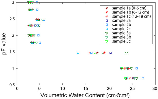 To gain more insight in the soil characteristics and grain size distribution over the vertical and horizontal plane of the beach, a total of nine soil moisture retention curves (pF-curves) were made in the Wageningen Soil Physics Laboratory from samples taken on 20 October 2015. Three soil samples were taken over different depths (top layer 0–6 cm, second layer 6–12 cm, third layer 12–18 cm) in three different beach zones, that is, in the swash near the low-tide level, on the intertidal beach and at the dune foot. A pF-curve was measured on intact soil cores using tension table and pressure plate methods [36]. All points on the pF-curve describe equilibrium situations between suction and moisture content. The suction is presented as pF, which is the logarithm of the suction in centimetres. Figure 2 shows that all pF-curves, despite being taken in different zones and over different depths, show minimal variation, implying that the soil has the same characteristics over depth and width of the beach. The soil reaches complete saturation with a volumetric value of = 25%, while the residual volumetric moisture content = 3.5%, implying that the soil never dries out completely. The pF-curves also show a quick (horizontal) drop in moisture content at pF . Such a steep transition indicates that the grain size distribution is very well-sorted. This was confirmed by several sieve curves that were taken from the Egmond beach sand. Results show that the grain size distribution is well sorted over the entire beach with a D10 of 300–425 m, a D50 of 250–300 m and a D90 of 180–250 m.