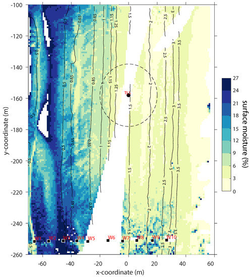 Example of a surface moisture map made with the Terrestrial Laser Scanner (TLS) on 29 September 2015 with a grid size of 1 × 1 m. The darker blue colors represent high surface moisture content with a maximum of 25% and lighter yellow colors represent low surface moisture content with a minimum of 3%. Positive x is landward, and positive y is to the north. W1–W10 indicate the position of the groundwater wells in a cross-shore array and the circle around the TLS indicates values that are less reliable according to Smit et al. [18]. The contours are elevation with respect to Mean Sea Level.