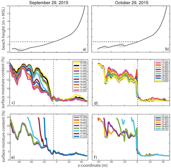 Going from this general characterization of spatial surface moisture to more detailed dynamics during rising and falling tides, we next analyze cross-shore transects. Figure 7 shows cross-shore transects of median beach height (a and b) and surface moisture values over y for the same x-coordinate taken on 29 September and 29 October 2015 during falling (c and d) and rising tide (e and f), per half an hour and 15 min, respectively. Figure 7a,b) clearly show a sandbar–trough morphology. Surface moisture variations during falling tide (Figure 7c,d) above the high water line ( m) are minimal, with . Surface moisture below the high water line varies substantially with time and can decrease with a rate varying between ∼2.5% to 8% per hour, and cumulatively 16% during a single falling tide. Closer towards the sea, near the bar–trough, surface moisture dynamics decrease and has high values around 22%, but the dynamics are more evident than on the back beach. The locations of the bar and trough are well displayed in surface moisture contents as well. At the location of the bar surface moisture shows a steep drop from near the waterline to ∼15% on the bar. Towards the trough surface, moisture increases again towards complete saturation ().
