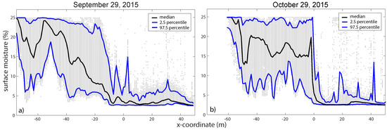 Figure 8a,b shows a summary of all median surface moisture transects for each laser scanning day (29 September and 29 October, 2015, respectively). Figure 8 reveals that, consistent with earlier studies [15,19], the beach can be conceptualized into three surface moisture zones: (1) the wet zone, the beach just above the low-tide swash with 18–25%; (2) the intertidal zone with 5–25% (with large spatiotemporal fluctuations indicated by the 2.5 and 97.5 percentile lines); and (3) the back beach zone: –7%. The bar–trough system is visible as a disturbance to this overall zonation. The trough remains always saturated, while the more seaward bar can dry to between 5–10%.