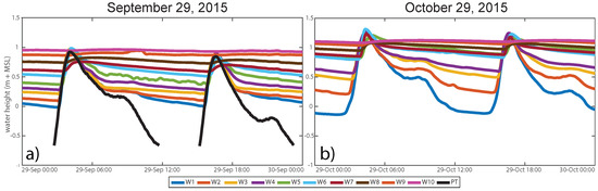 Time series of elevations on (a) 29 September 2015 and (b) on 29 October 2015. The different line colors represent different pressure transducers W1 (sea) to W10 (dune foot). On 29 September, the pressure transducer in the sea which measures tidal fluctuations was working properly and is represented by the black line.