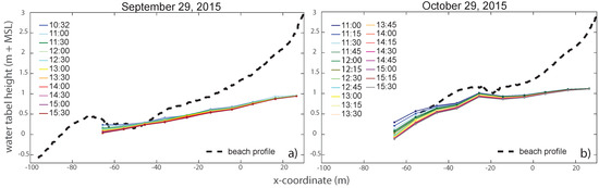 Groundwater levels over a cross-shore transect during falling tide on (a) 29 September and (b) 29 October 2015. The different colors show different moments in time. At each time step a corresponding surface moisture map by the TLS was taken.