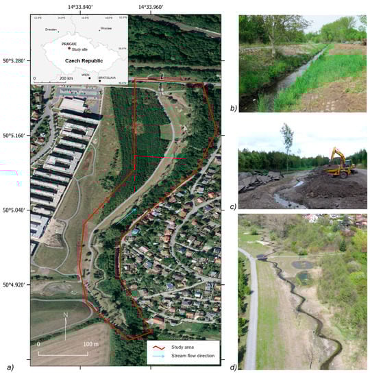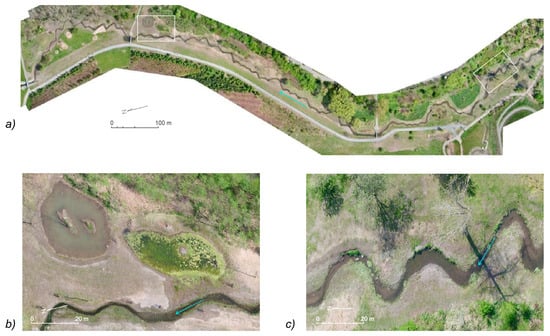 Compared to the natural environment, the streams in urban areas feature specific properties. The streams often feature narrow channels, riparian zone constrained by the city plan and infrastructure, and experience heavy modifications due to the intense development in the urban area [,]. Hence, monitoring and evaluation of the stream restoration projects and evaluation of their progress here require high spatial resolution and precision, enabling monitoring of the physical properties of small streams with high operability, able to track the changes in the urban environment as well as the effects of significant events, typically floods. For such applications, the rapidly evolving UAV technologies open up a highly perspective means of surveying. The unmanned platforms feature high versatility, especially due to the ability to carry different sensors according to the given task [,,,]. The 2D and 3D spatial data acquired from the UAV photogrammetry allows the derivation of information about stream channels and floodplains with spatial resolution superior to the conventional data sources []. The orthoimagery, typically featuring a resolution of 2–3 cm per pixel, allows the detection of even the fine details of fluvial features and allows the tracking of the changes of stream properties and fluvial forms [].