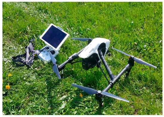 The Inspire 1 Pro platform (Figure 2), used for the imaging since November 2015, is driven by four propellers, enabling a flight of a length of 15–22 min, according to the payload. The maximum distance of the control system is 2 km, the physical maximum altitude of 1 km [] is, in practice, limited by the legislation regulations, limiting drone traffic at a level under 300 m above ground. The control system of the drone also allows, besides the manual control, the flying of pre-programmed routes, which was used for the recurrent imaging campaigns. The platform was equipped with the DJI Zenmuse X5 camera (cDJI, Shenzen, China) with interchangeable lenses, equipped for this study with the 12 mm Zuiko prime lens (Olympus, Tokyo, Japan) with 84° field of view (FOV), 24 mm equivalent in 35 mm system, and with a Zenmuse X3 camera (DJI, Shenzen, China), featuring a fixed lens with focal length 3.6 mm (94° FOV, 20 mm equivalent in 35 mm system). The X5 camera has a 17.3 × 13.0 mm CMOS sensor of micro 4/3 standard, featuring a resolution of 4608 × 3456 pixels (16 Mpix), capturing in Red, Green and Blue (RGB) spectral bands. The X3 camera features a Sony EXMOR 1/2.3” CMOS chip (Sony, Tokyo, Japan) with a resolution of 4000 × 3000 pixels []. The DJI Phantom Vision plus, used for the first two campaigns, is a multirotor platform, equipped with a 14 Mpx panchromatic camera with a resolution of 4384 × 3288 pixels and a fixed lens with 5 mm of focal length and 110° FOV, equivalent to 18 mm for 35 mm system [].