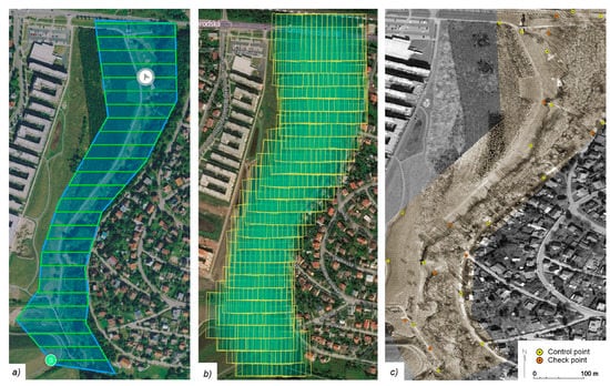 For georeferencing, 26 ground control points (GCPs) were used. The control points were defined at the stable structures of the urban environment, which are apparent in the imagery and have geodetically surveyed position available from the digital city plans, such as sewer lids, edges of buildings, or concrete structures (Figure 3c). From the total of 26 GCPs, 15 were used as control points for georeferencing and 9 as checkpoints to validate the accuracy of photogrammetric processing. Mean differences in x and y coordinates at the checkpoints typically reached 1.5–3.5 cm, while the maximum differences, observed at the outer parts of the scene, did not exceed 10 cm.