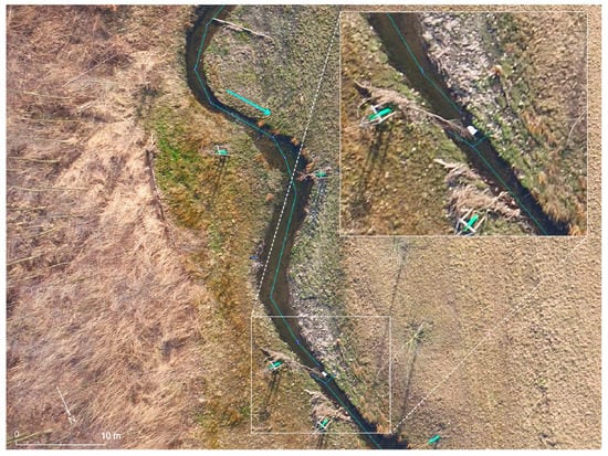 Recent advances in the accessibility and quality of remote sensing data products accelerate the number of their applications in landscape studies, including water management. Remote sensing data represent an accurate and reliable tool for landscape planning, enabling objective assessment of the complex segments of the riverscape [,]. However, the broader use of satellite imagery in the stream restoration design and monitoring projects remains limited due to the coarse spatial resolution of the imagery []. The low spatial resolution of the imagery, however, limits applications of the satellite data to large rivers, where the potential of the multispectral and hyperspectral imagery is used mainly for classification of vegetation properties of the riverscape [,]. The substantial shift of the applicability of the remotely sensed data has been brought by the increasing availability of high-resolution aerial orthoimagery, allowing the distinction of basic hydromorphological properties of the physical stream habitat [,]. However, the orthoimagery products based on the airborne imagery still suffer from two substantial limitations. First, the imagery resolution, although continuously increasing, still does not allow the analysis of the physical habitat and structural properties of small streams, typical in the urban and suburban environment, that are the subjects of restoration. Second, and more important, is the limitation by low temporal resolution and poor operability of the survey. The typical interval for a geodetic survey is in years, while the monitoring of the stream restoration projects requires higher frequency and flexibility to capture the data on demand.