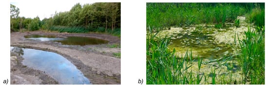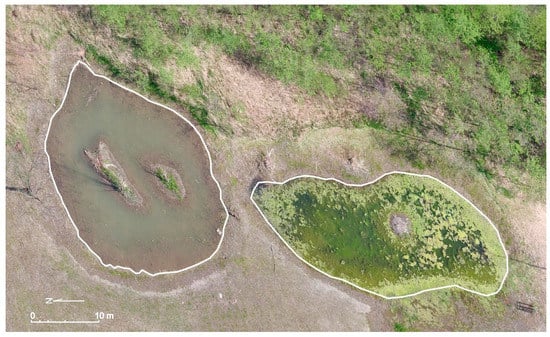 In this study site, the progress of overgrowing and eutrophication in the newly created ponds was tracked based on the UAV imagery. The newly built ponds in the floodplain of Hostavicky brook became subject to spontaneous overgrowing and eutrophication processes since the restoration completion (Figure 6).