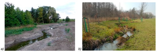 Vegetation succession in the riparian zone of the Hostavicky brook. (a) Bare surface of the newly built meandering belt in September 2015, (b) coherent grass cover in the same stream segment in April 2018. Photo by J. Langhammer.