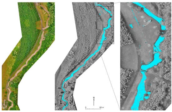 Detection of the extent of the flood spill during the crest of flood in 29 June 2017. (a) Orthoimage of the Hostavicky brook during the flood crest, (b) Classification of the water extent during the flood crest in the study area, (c) Detailed view to the classification results.