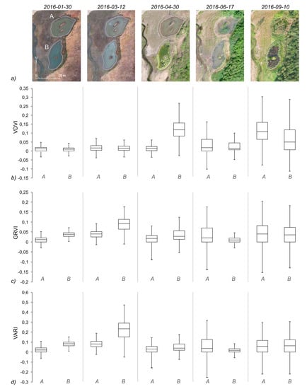 This study proved that the UAV imagery in visible bands can also be used alonsgside the rapid mapping for a qualitative analysis of the riparian habitats. The spectral limitations of RGB sensors may be partially bypassed by limiting the analysis to the area under the mask of the study spot, which helps to minimize the false detection of features with similar spectral response but of different functional categories. This can be demonstrated by the detection of eutrophication processes in the new ponds using the VDVI index. Here, the reliable application of the indices calculated from visible bands was enabled by the restriction of the analyzed area to the mask of water extent. Testing of three vegetation indices based on RGB imagery proved substantial differences in their reliability. Although all of the indices have proven their performance in the literature, it is apparent that the results from specific case studies [,,] should always be taken with caution and verified in conditions of the given environment. In this study, from the three tested indices, only VDVI index was able to correctly reflect the dynamics of the eutrophication and overgrowth when applied to the selected area under the mask of the ponds and is thus promising for applications in tracking the riparian processes. On the contrary, in the conditions of riparian vegetation in mid-latitude small urban stream, both GRVI and VARI indices were unable to correctly track the eutrophication, nor the overgrowth of the ponds.