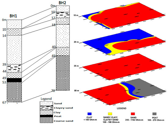The lithofacies distribution at 50 m shows a stripped pattern, sand underlay about 65% of the area, which increasingly changes to sandy clay/clayey sand northwards. Around the extreme north, a layer of peat was delineated in a belt trending in a northwest–northeast direction. The resistivity variation within the peat layer varied between 185 and 270 Ohm-m These values are consistent with those reported by [25], whose values varied between 200 and 300 Ohm-m. Our result is, however, contrasted with those described by [26], whose peat resistivity values were slightly less than 100 Ohm-m. The resistivity of peat to a certain degree is dependent on the degree of decomposition and moisture content [26]. This is probably reflected in the different values of peat resistivity they described. For instance, an increase in the resistivity of peat is attributable to its high organic content; the high resistivity values measured in this study may be adduced to the organic content of the peat. The thickness of the peat from borehole 1 and as showed in lithological log of BH1 is about 4 m. Noticeably in BH1, the peat occurs at depths of 49 m to 53 m, but is conspicuously absent in BH2 (Figure 2). The proximity of BH2 to the Benin River probably presented an unfavourable environment for the preservation of peat at the time of deposition. The absence of which is probably adduced to the complete decomposition of peat, which was promoted by the available sufficient oxygen that led to the destruction of the peat in this area. The oxygen may have been supplied by the flowing rivers, whose water was oxygen rich and was supplied to the evolving peat.