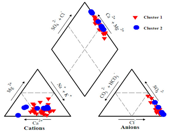 Piper plot for the classification of major anions and cations into groundwater types.