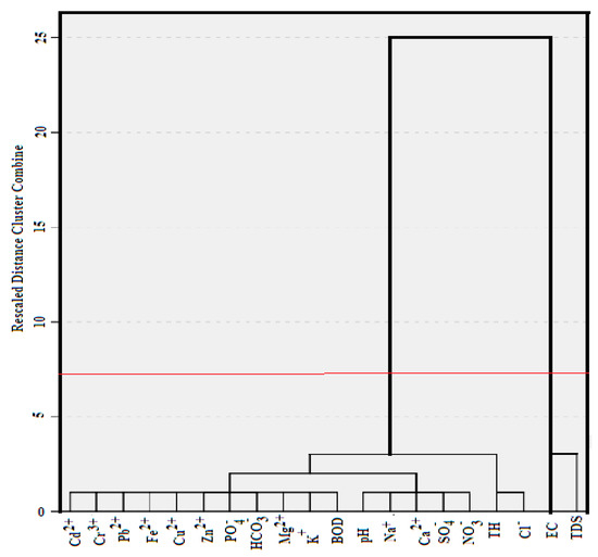 Figure 5 shows two clusters obtained from the cluster analysis of 20 groundwater variables. Cluster 1 represents measures of NO3− SO4−, Ca2+, Na+ and pH (sub-cluster 2) and Cl−, TH (sub-cluster 3)