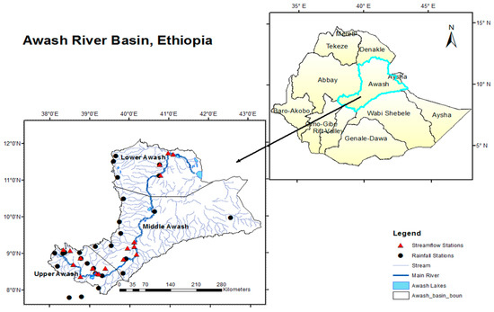 Water resources in Ethiopia are highly vulnerable to climate and hydrological variability due to its topography and human-induced factors, such as land degradation, high population density and water management practices [4,5,6]. Ethiopia has twelve river basins, out of which the Awash River Basin (ARB) is intensively utilized and environmentally vulnerable. Freshwater biodiversity, basin habitat and human livelihood are exposed to a risk due to over-abstraction of river water, population growth and poor water management [7]. The Intergovernmental Panel on Climate Change (IPCC) Africa report indicated that in the highlands of Ethiopia, where there is a high and heterogeneous topography, rainfall and floods are expected to increase during the final period of the 21st century [1].