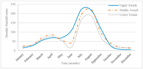 The mean monthly rainfall (mm) at Upper, Middle and Lower Awash River Basin (ARB).