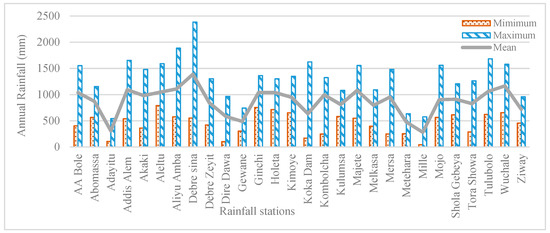 Figure 3 shows annual rainfall of the 28 rainfall stations in the ARB; the annual rainfall varied from 281 to 1389 mm. The Debresina and Mille stations recorded the highest and lowest annual rainfall, respectively.