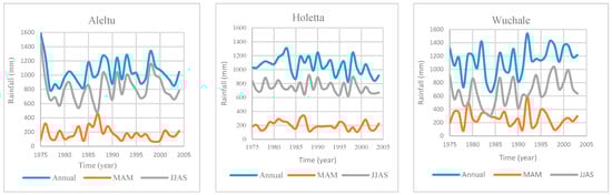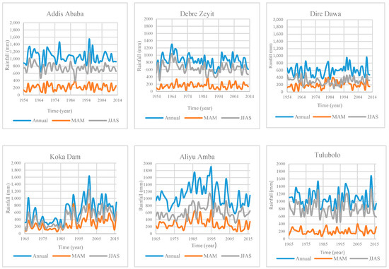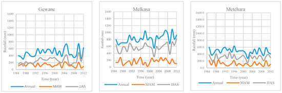 The mean monthly rainfall showed a bimodal pattern with two rainy seasons in the Middle Awash and Lower Awash, while unimodal rainfall was indicated in the Upper Awash. The two rainfall regimes in the Middle and Lower Awash occurred in JJAS and MAM, which presented the main and shorter rainy periods, respectively. Moreover, in all the rainfall stations, the minimum rainfall was recorded in December while the maximum rainfall occurred in August and September. These rainfall regimes coincide with the main agricultural seasons in Ethiopia, whereby agricultural production is predominantly reliant on rainfall. The study by [16,24] indicated a similar rainfall pattern; which was unimodal rainfall in Upper Awash and a bimodal rainfall in the Middle Awash and Lower Awash.