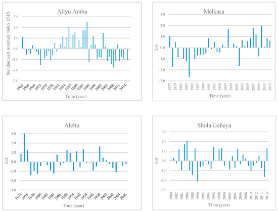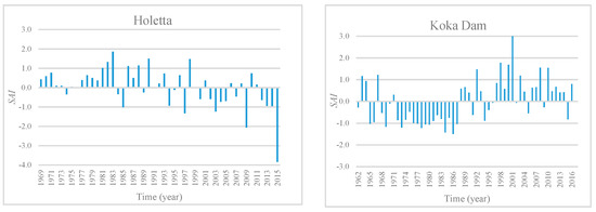 Figure 6 shows the SAI of the annual rainfall for selected rainfall stations in the ARB. The figure shows that the negative anomaly varied from 40% to 64% of the total number of observations at Holetta and Aleltu, respectively. On seasonal time series, MAM and JJAS showed a negative anomaly between 47% to 63% and 43% to 59% of the observations, respectively. The MAM rainfall displayed a higher negative anomaly at Shola Gebeya, whereas JJAS showed a higher negative anomaly at Aliyu Amba. In some stations a negative anomaly was observed in consecutive years, for example, Koka dam, Aleltu and Melkasa.
