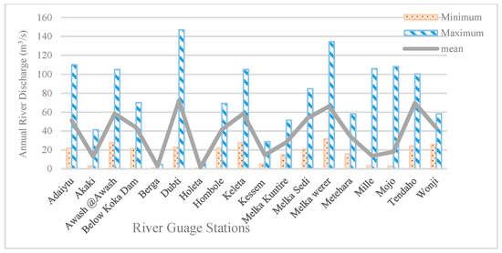 Figure 8 shows annual streamflow of 18 stations in the ARB. The annual flow varied from 1.73 m3/s at Holetta to 72 m3/s at Dubti. The maximum and the minimum annual discharge was recorded at Dubti and Holetta stations, respectively.