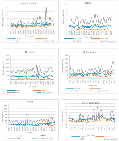 Figure 9 shows annual streamflow variability at six stations. The hydrographs had a similar pattern on annual and MAM river discharge, except for a few years with extremely high flow records. Extreme streamflow was recorded at the Kessem and Mojo stations in 1988 and 1996, respectively. A similar increase in flow during these years was shown in all the other stations. Both the graphical and linear trend on annual streamflow illustrated a positive trend, except at Holeta, Mojo and Wonji.