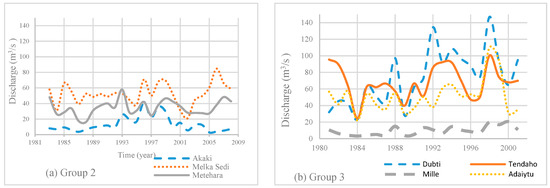 The temporal streamflow variability of Groups 2 and 3 stations are presented in Figure 10. In Group 2, the annual streamflow varied from 2.89 m3/s at Akaki to 84.80 m3/s at Melkasedi (Figure 10a). Melkasedi and Metehara exhibited the same pattern of variation with moderate increase and decrease during the period of the observations. Peak flow was exhibited in 2006 at the Melkasedi and in 1993 at Metehara stations. At the Akaki station, a high temporal variability was recorded from 1992 to 2000, while the peak flow occurred in 1996. Similar to Group 1, the graphical and linear trend on annual streamflow was positive in all stations of Group 2. The hydrograph of Group 3 shows a temporal increasing and decreasing pattern, and the extreme flow was recorded at Dubti in 1992. The minimum flow at Dubti, Tendaho and Adaiytu were relatively similar and occurred in the same year, 1984. The analysis on annual flow of Group 3 demonstrated an increasing trend in all stations except at Tendaho (Figure 10b). However, in the MAM period, all Group 3 stations presented a decreasing trend except at Dubti.