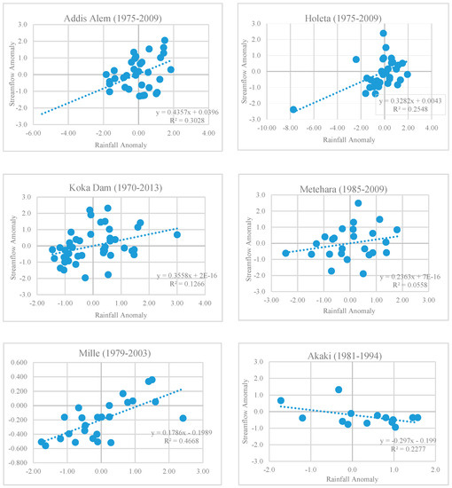 The annual rainfall and streamflow at six stations indicated a positive correlation coefficient which varied from 0.24 to 0.68 (Figure 11). The correlation coefficient was 0.5, 0.55 and 0.68 at Holetta, Addis Alem and Mille, respectively (Figure 11). By comparison, the correlation was low at two stations: Metehara (0.24) and Koka Dam (0.36). On the contrary, two stations (Adaiytu and Mojo) showed both a positive and negative relationship in a different time series. The current finding revealed the existence of a positive correlation in a majority of the tested stations.