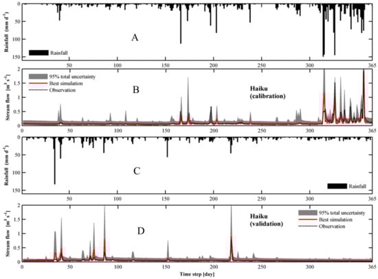 - Sahoo, G.; Ray, C.; De Carlo, E. Calibration and validation of a physically distributed hydrological model, MIKE SHE, to predict streamflow at high frequency in a flashy mountainous Hawaii stream. J. Hydrol. 2006, 327, 94–109. [Google Scholar] [CrossRef]
