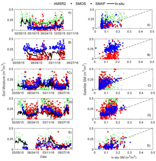 The direct comparison of the two datasets showed significant variability among the different remotely sensed data. SM products obtained from SMAP were more consistent compared to other sensors and showed closer agreement with in situ observations (with and average R = 0.55 and RMSE = 0.078 m3 m−3). AMSR2 and SMOS provided progressively a lower correlation with local measurements with values that move from 0.49 to 0.34. All evaluated sensors showed an overestimation with regards to the observed SSM data in the studied areas.