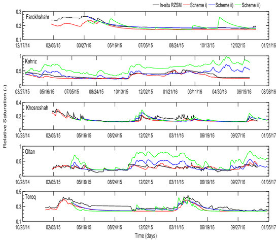SMAR model was applied at daily scale in all station except for Toroq, where the time-step (tj − tj−1) in Equation (2) was set equal to 3 days and/or 4 days as a function of the available in situ measurements. Time series of RZSM predicted with the three mentioned SMAR schemes and measured in situ data at one point are depicted in Figure 4.