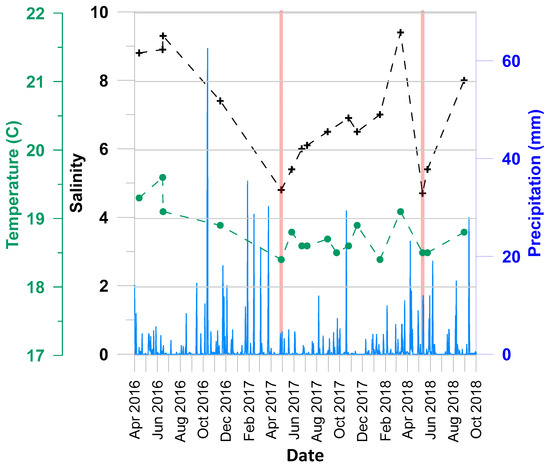 Salinity and temperature of the karstic spring waters and precipitation (daily averages recorded at the nearby Leucate station; https://www.infoclimat.fr/) during the period of observation (2016–2018). The two red vertical bars point to the two salinity minima.