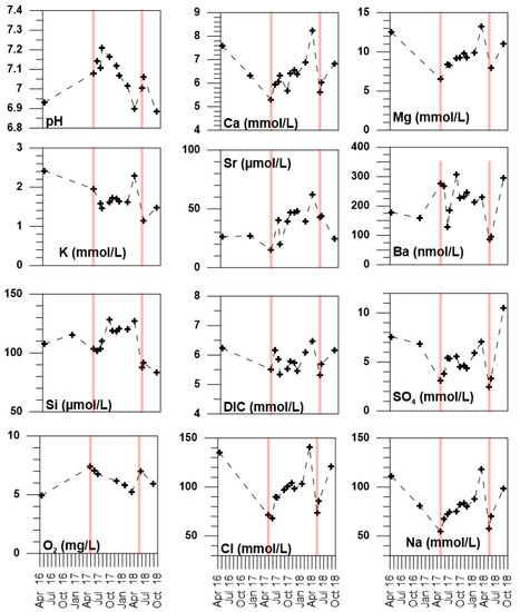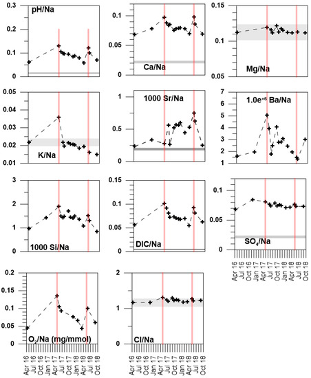 The maximum pH value in the data set is observed for July 6, 2018 and is offset when compared to the salinity minimum which occurred on April 28, 2017 (Figure 3). The Na-normalized concentrations (Figure 5) remove the effect of dilution. Then the maximum in pH/Na normalized concentration coincides with the maximum values for the other Na-normalized concentrations, notably O2/Na, DIC/Na, K/Na, and Ca/Na, and with the two salinity minima, as well as a minimum for SO4/Na (Figure 5). Although brackish, the karstic spring waters do not exhibit elemental ratios characteristic of modern seawater. Their Ca/Na, SO4/Na, DIC/Na, and Sr/Na ratios are higher than those of standard seawater [33], aside from K/Na and Mg/Na (Figure 5).